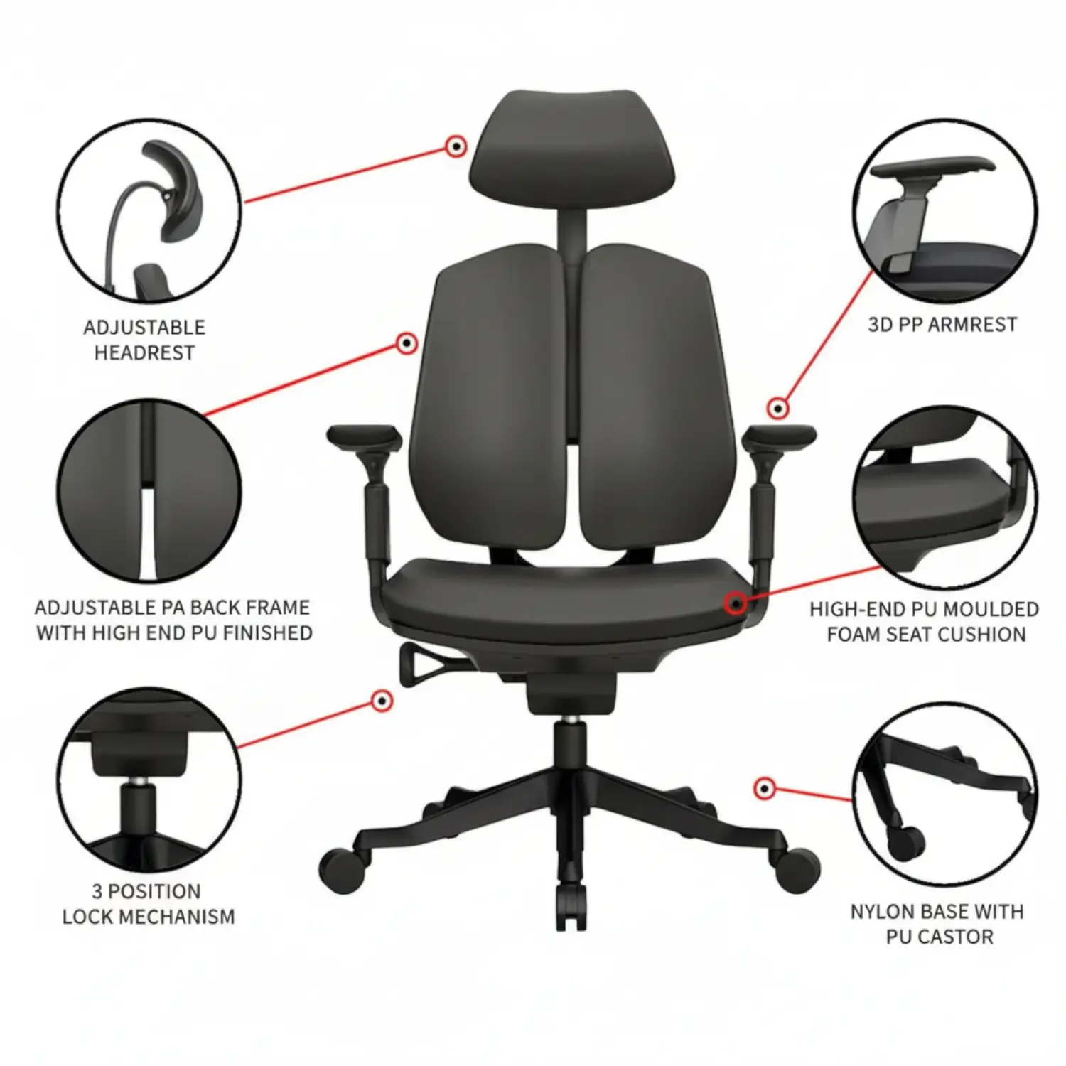 | Material Made Of: Breathable Mesh Fabric and PU Molded Seat Cushion with Seat Cover |