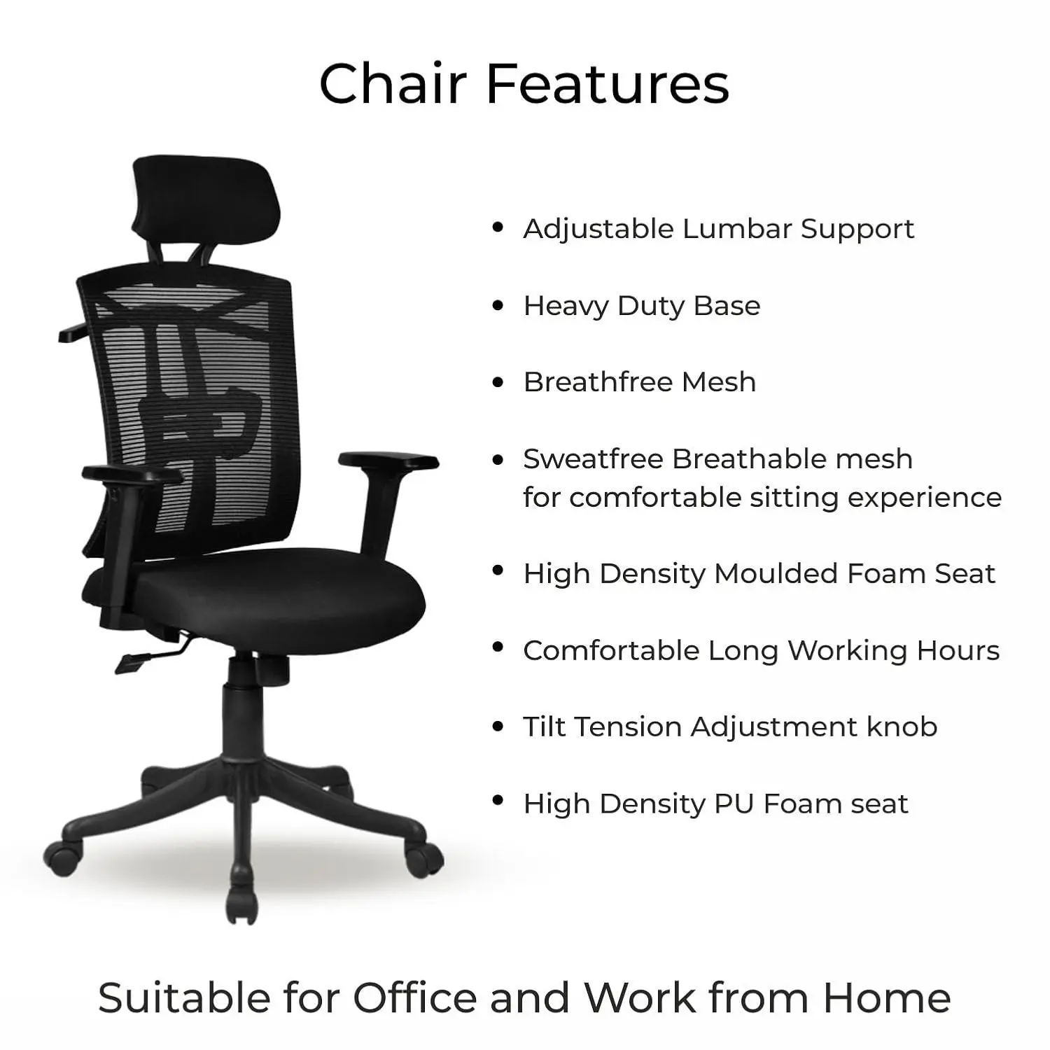 Ergonomic Posture Support: Engineered to encourage better spine alignment and reduce strain during extended sitting sessions. Adjustable lumbar support helps maintain a healthy posture throughout the day.