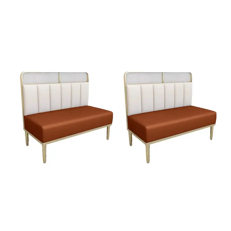 Premium dual tone leatherette upholstery, rich terracotta and ivory color combination, gold finished sturdy metal frame, deep cushioned seating for maximum comfort, vertically channeled backrest for lumbar support, easy to clean and stain resistant surface, suitable for high traffic commercial environments, lightweight yet durable construction.