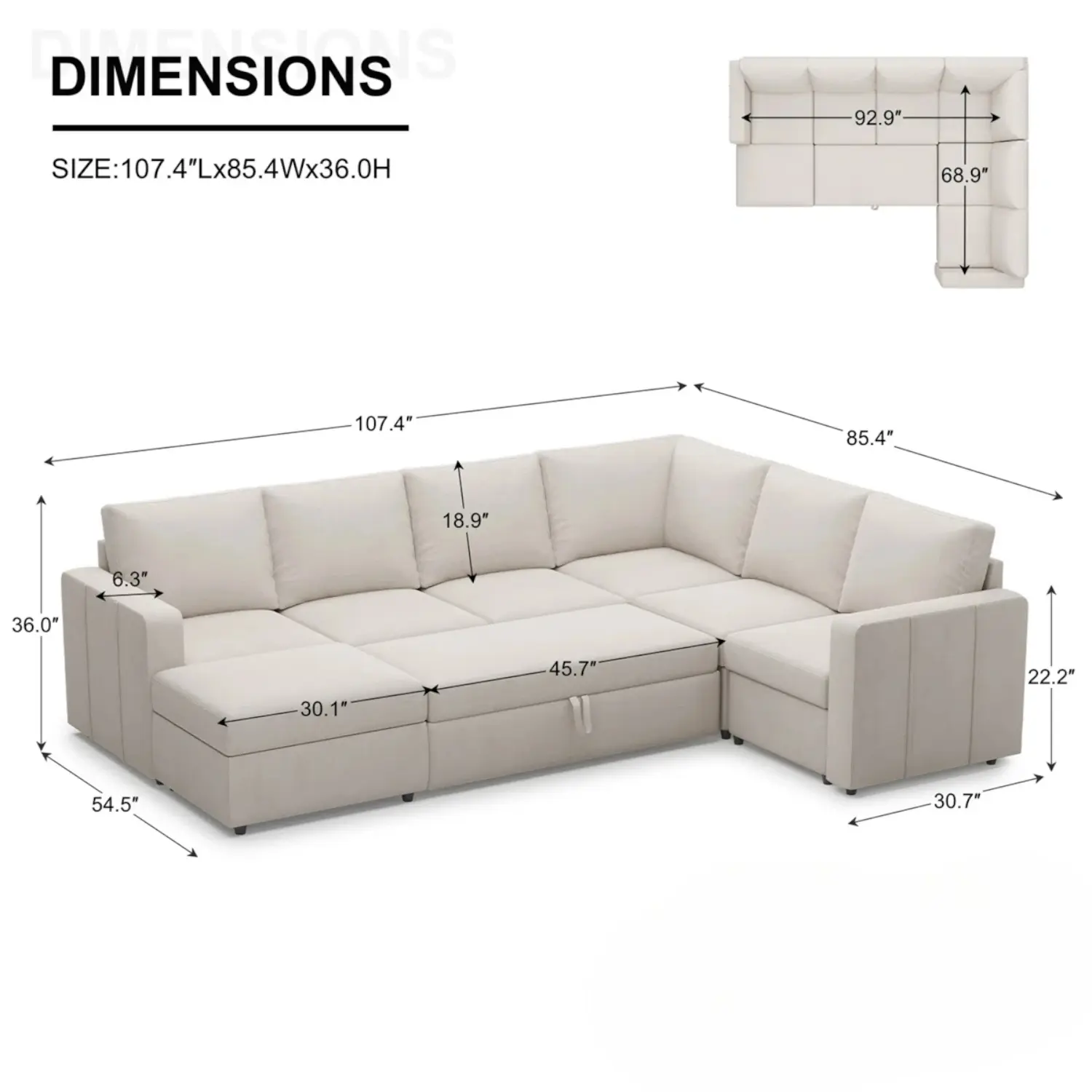 | Overall Size in Centimeters: 91.4 H x 77.9 W x 272.7 L | Overall Size In Inches: 36 H x 30.7 W x 107.4 L |