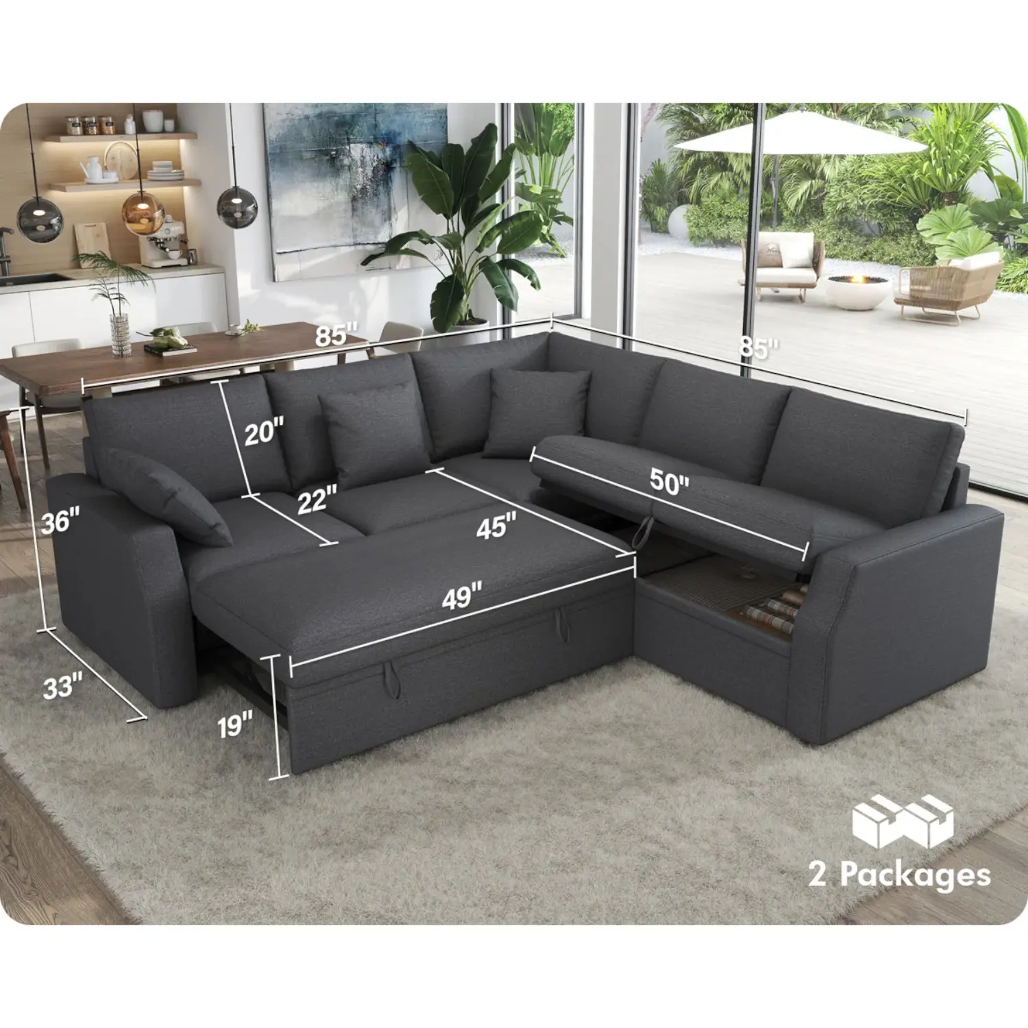 | Overall Size in Centimeters: 91.4 H x 83.8 W x 215.9 L | Overall Size In Inches: 36 H x 33 W x 85 L |