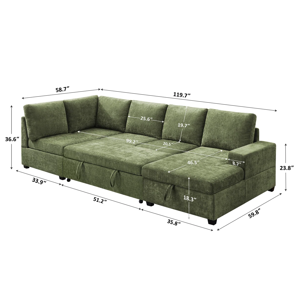 Overall Size in Centimeters: 92.9 H x 151.8 W x 304 L Overall Size In Inches: 36.6 H x 59.8 W x 119.7 L