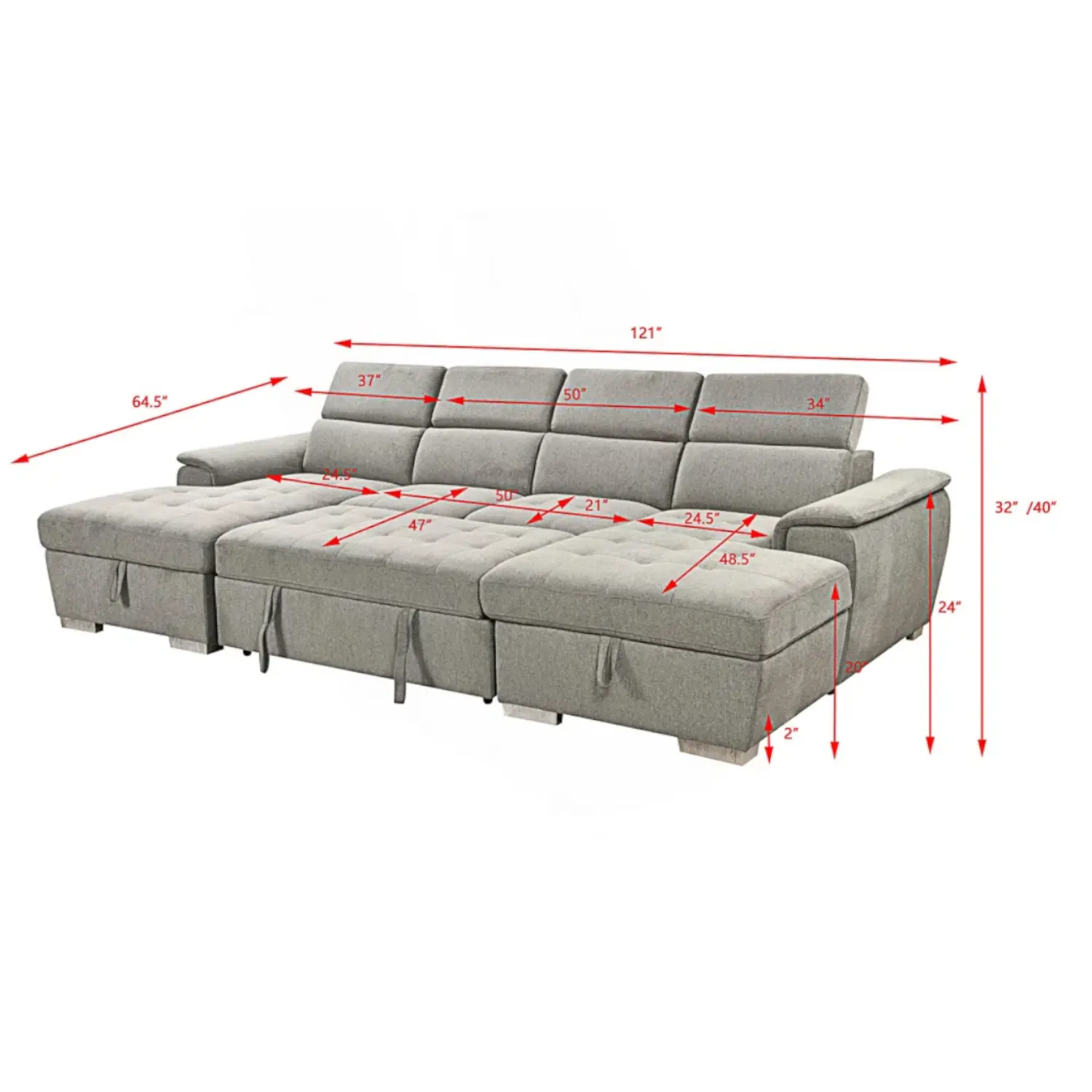 | Overall Size in Centimeters: 101.6 H x 163.8 W x 307.3 L | Overall Size In Inches: 40 H x 64.5 W x 121 L |