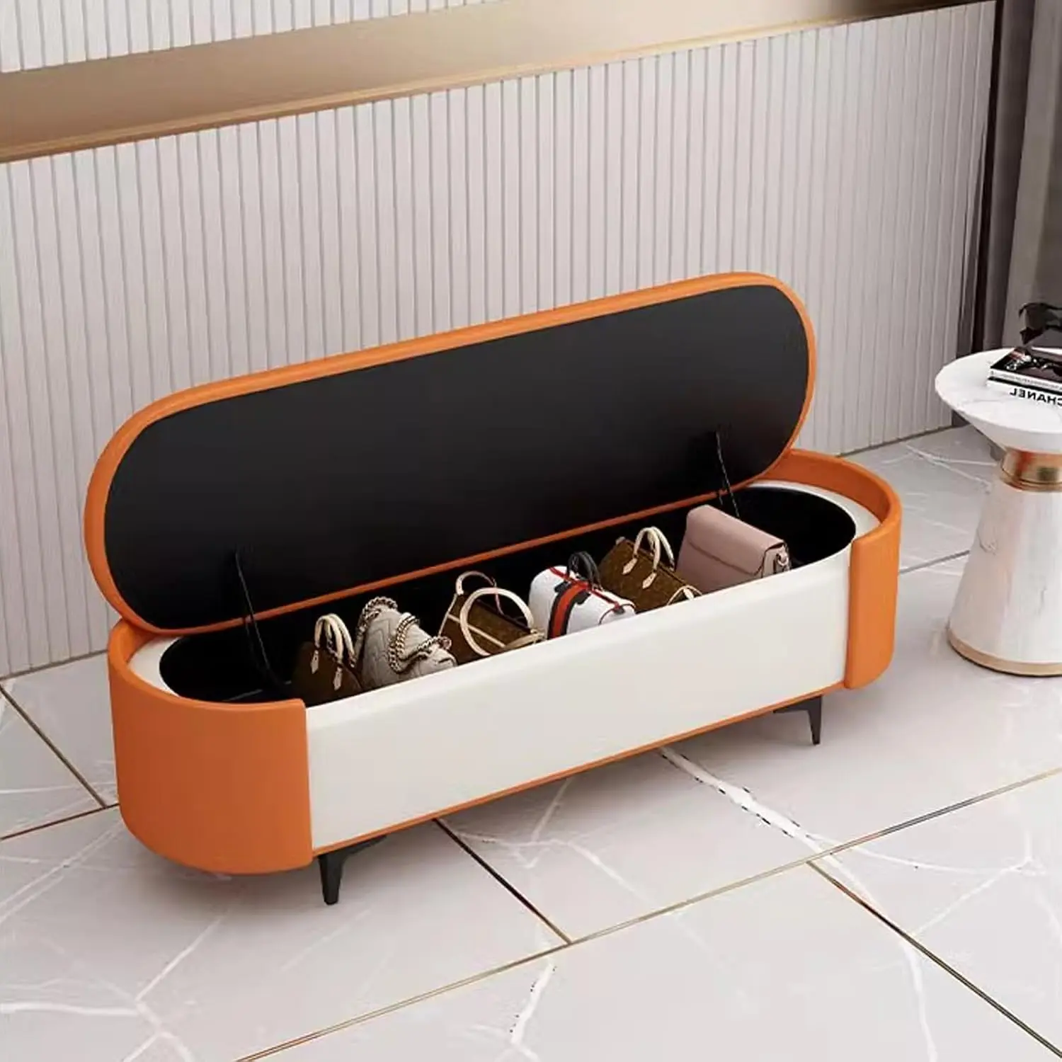 Lift the cushioned top to access a spacious interior, ideal for storing blankets, pillows, magazines, toys, or daily essentials. -