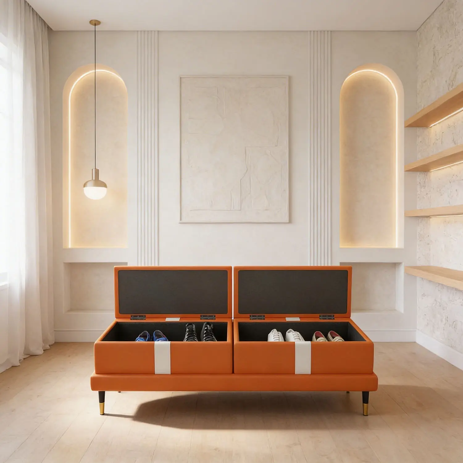 Lift the generously cushioned top to reveal spacious hidden storage — ideal for keeping blankets, cushions, books, magazines, or everyday essentials neatly tucked away. Its versatile design allows it to function as: