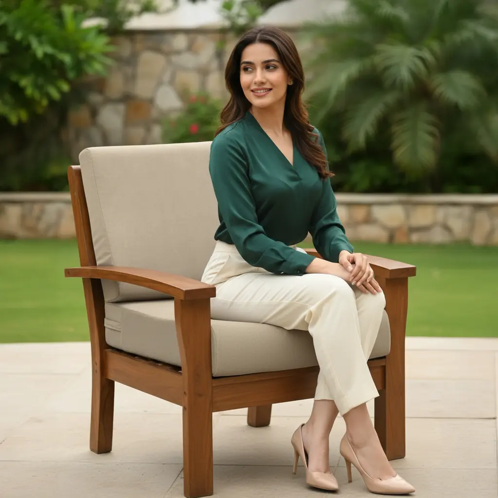 4. Thickness and Firmness The thickness and firmness of a cushion can greatly affect comfort. For example, if you prefer a firmer seating experience, a thicker foam cushion for wooden sofa with high-density foam will suit your needs. We Provide 5 Inch Thick cushion and 4 Inch Back cushion with Ergo Shape for Better Seating.